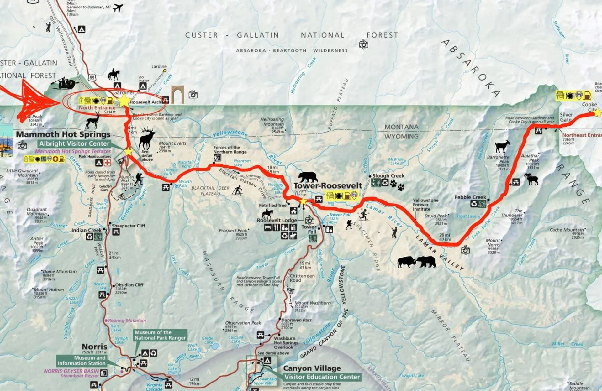 En hiver, les routes du Parc du Yellowstone sont fermée à la circulation. La route du nord entre Gardiner et Cooke City via Mammoth Hot Springs, Roosevelt Tower et Lamar Valley est l'une des rares accès régulièrement déneigés sur environ 80 km.